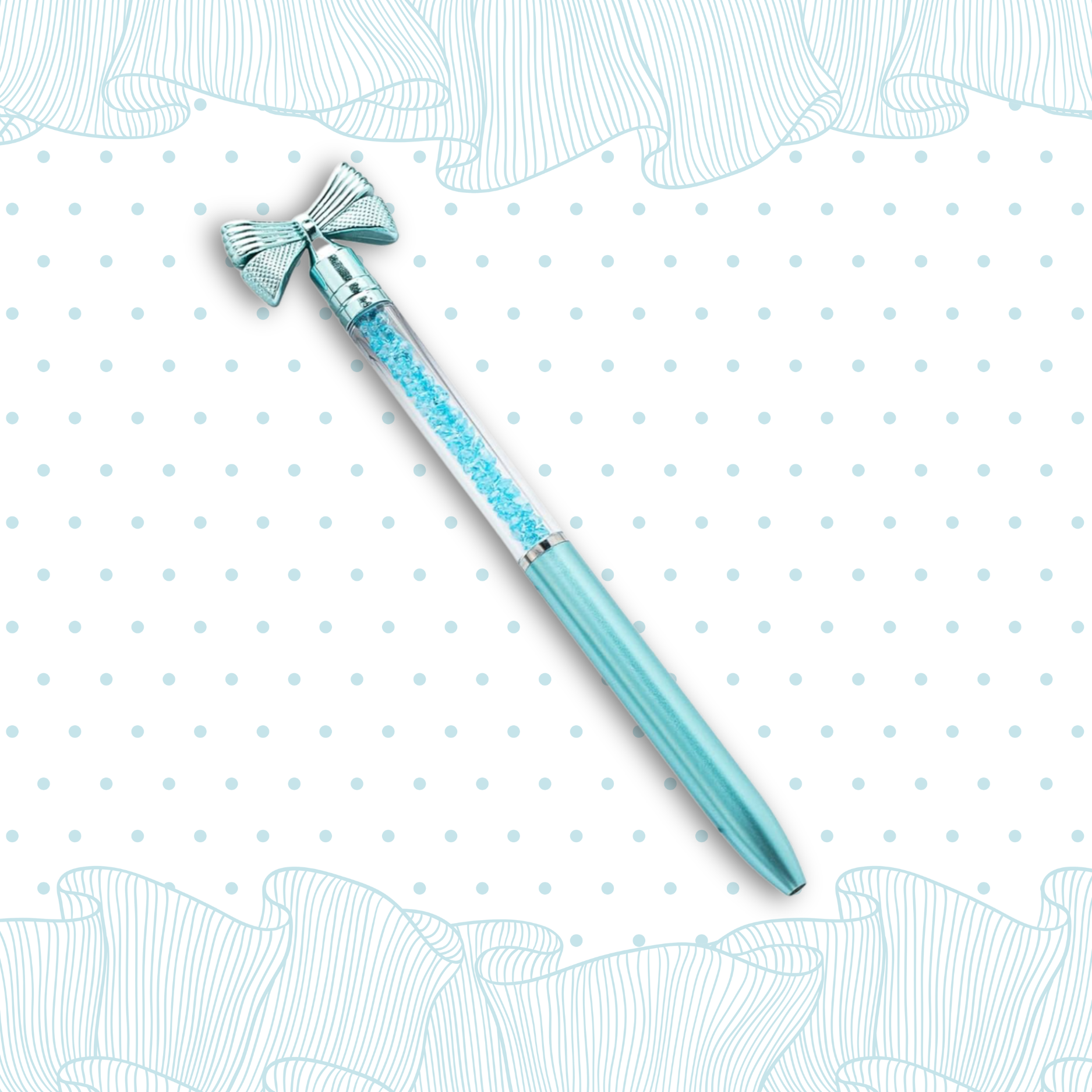 Black Ballpoint pen featuring crystals and metallic blue bow topper.