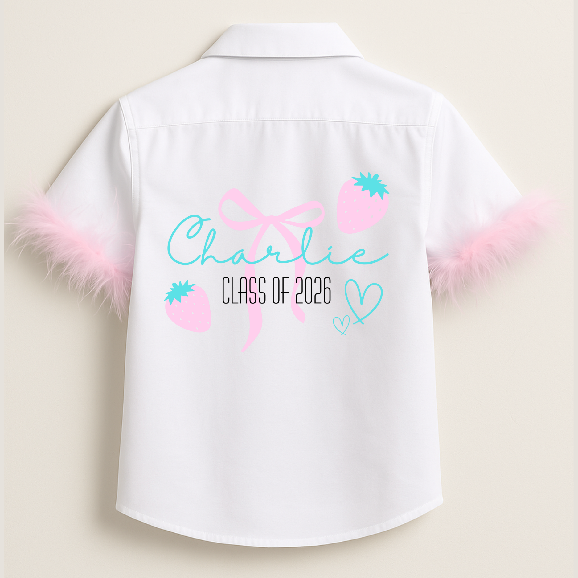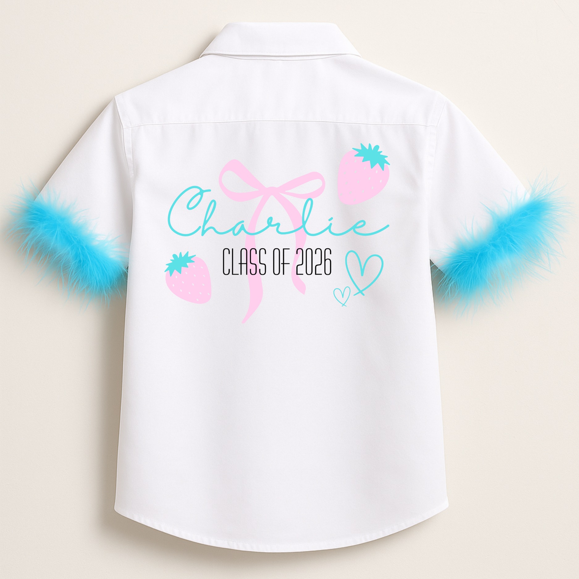 Pick from a huge range of font colours, add cute bows to the sleeves, or finish it off with feather trim – it’s your shirt, your style!